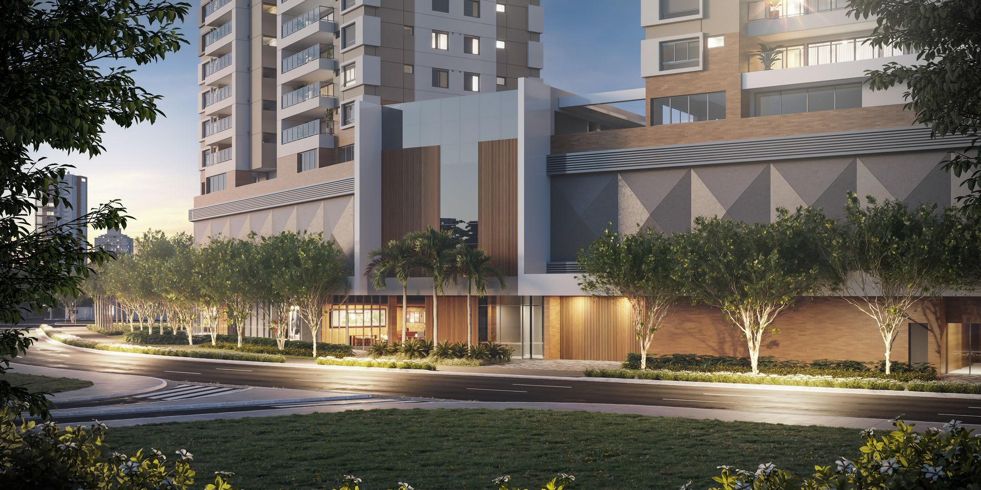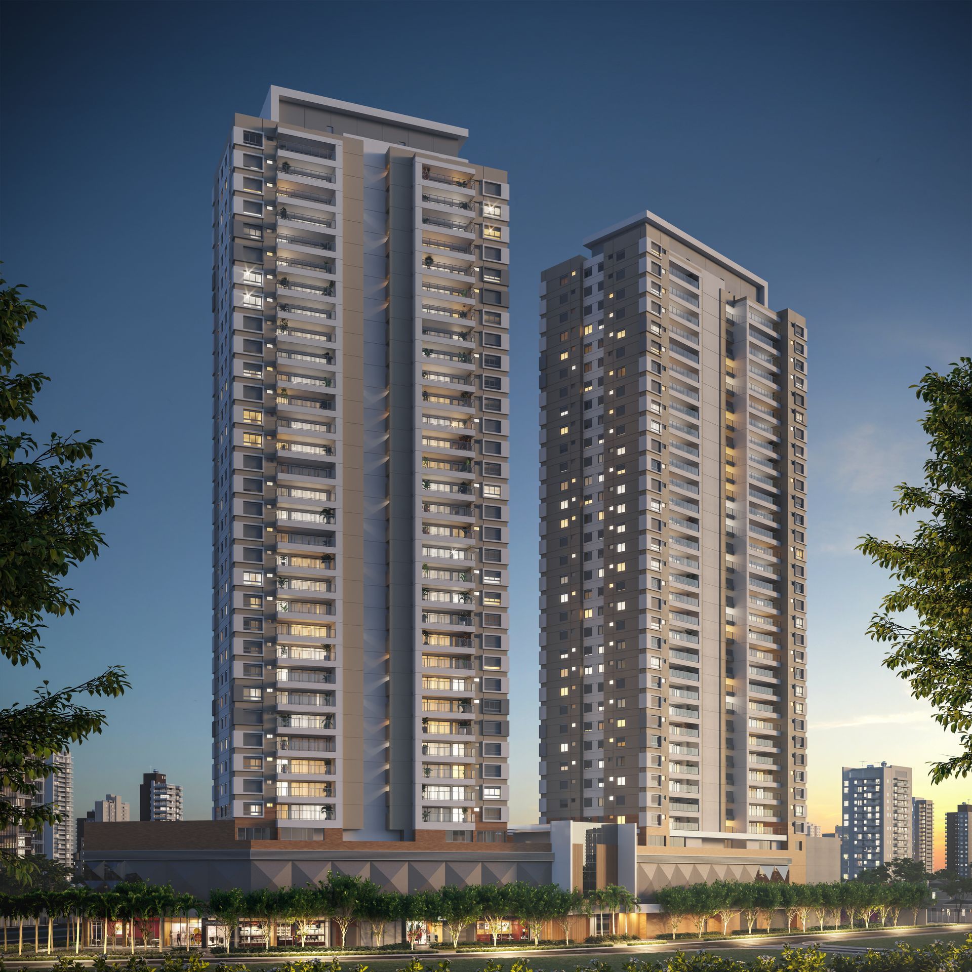 No que diz respeito ao conceito de volumetria, foram cuidadosamente integrados elementos distintivos ao embasamento, conferindo-lhe dinamismo e reforçando a identidade singular do empreendimento. Por outro lado, as torres se destacam pela presença de terraços amplos e coroamentos marcantes, adicionando um toque de imponência à sua silhueta.